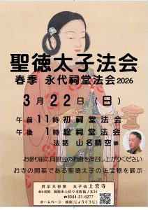 お昼は同朋会のお斎をおめしあがりください。宝物殿では聖徳太子の展示をします。