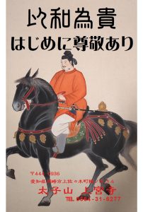 第1は今年の干支にちなんで挨拶の絵としてお寺にある「聖徳太子の黒駒騎乗図」を選んだからです。そこから自然と「和を以て貴しと為す」という有名な言葉が思い出されたました。