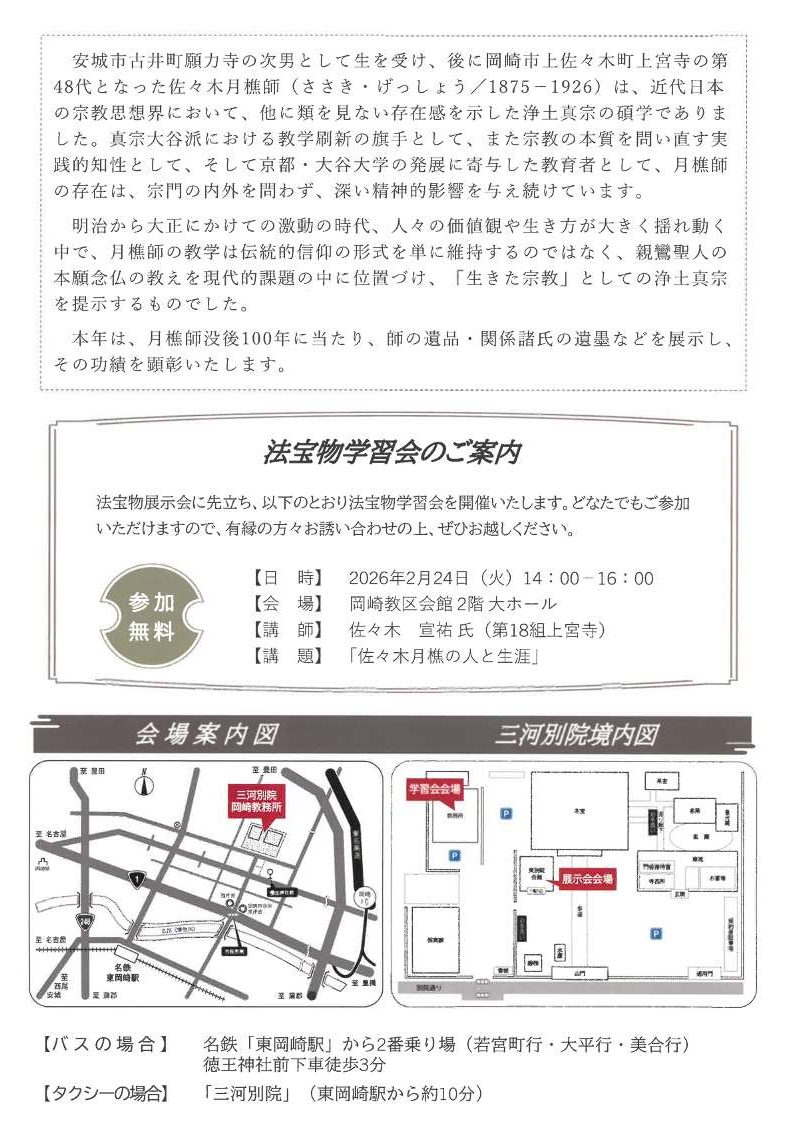 岡崎教区による佐々木月樵没後百年の企画展示会。月樵ゆかりの品々が展示されます。